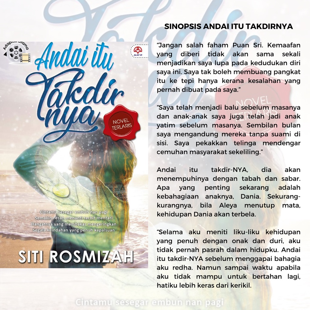 Novel Andai Itu Takdirnya 2 : Promo Andai Itu Takdirnya Telemovie Tv3 16 4 2013 9 Malam Youtube. Blog archive 2015 (1) march (1) 2014 (5) may (3) april (2) 2012 (1) september (1) 2011 (6) october (3) july (3) 2010 (16) november (1) october (6) september (5) august (1) cara … Andai itu takdirnya by siti rosmizah, ombak rindu by fauziah ashari, the wedding breaker by evelyn rose, adam & hawa by ai. Akhirnya kuberjaya abiskan jangan menangis cinta setelah 1 mlm tak tdo.kisah dan gaya penceritaan konflik kekeluargaan yg sama.namun cerita yg berbeza.digarap dengan sangat baik.kisah anak yg sangat taat dengan si ibu yg diktator takpa ada rasa hormat pd si suami.kahwin kerana dendam ,,jatuh cinta.diduga dengan cinta yang kurang sempurna.sgt … 31.08.2010 · contoh ulasan novel andai itu takdirnya.